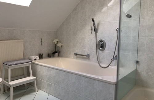Our guests also have a washing machine in the daylight bathroom with sink, bathtub, shower and toilet. Towels and hairdryer available.