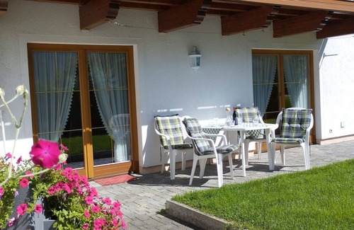 "Christina", 2-room apartment 42 m2, on the lower ground floor, east facing position. Beautiful and cosy furnishings: living/sleeping room with 1 double sofabed (150 cm), dining table and satellite TV. Exit to the terrace. 1 room with 1 bed and 1 double bed. Exit to the terrace. Open kitchen (oven, dishwasher, 4 ceramic glass hob hotplates, toaster, kettle, microwave, electric coffee machine). Shower/WC. Underfloor heating. Carpet. Terrace. Terrace furniture, deck chairs (2). Beautiful view of the mountains. Facilities: children's high chair, baby cot. Internet (WiFi, free). Parking (2 cars). Please note: non-smokers only. Smoke alarm. Attention: At ground level, but only accessible via a staircase!