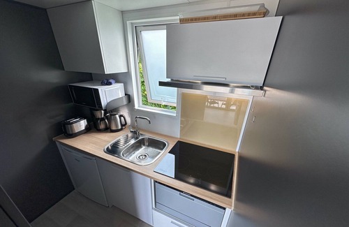 Layout: Ground floor: (Entrance, Kitchen(electric kettle, toaster, cooker(4 ring stoves, induction), hood, coffee machine(filter), microwave, dishwasher, fridge-freezer), Living/bed room(double bed(160 x 200 cm), TV(flatscreen, satellite, smart TV), dining table(2 persons)), bathroom(shower, washbasin), toilet(toilet)) tumble dryer(shared with other guests, paid), washing machine(shared with other guests, paid), heating(electric), terrace(private), garden(shared with other guests, 10000 m2), garden furniture, sun loungers, BBQ, parking, high chair, insect screens, Sunscreen, Volleyball court, Charging post for electric cars