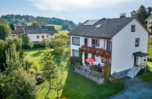 Die Ferienwohnung befindet sich in der 1. Etage und ist bestens geeignet für bis zu 4 Personen. Im Wohn-Schlafraum befinden sich 1 Doppelbett (2 x 2 m) und 1 gemütliche Sitzecke. Im zweiten Schlafraum stehen ein weiteres Doppelbett und ein Waschbecken zur Verfügung. Die separate Küche ist voll ausgestattet mit Geschirrspülmaschine, Backofen, Mikrowelle, Kaffeemaschine, Wasserkocher und einer Essecke. Das Badezimmer mit Dusche und Badewanne rundet das Gesamtbild ab. Das WC ist separat. Vom Wohn-Schlafraum und vom Schlafzimmer aus ist der möblierte Balkon zugänglich. Das Haus steht in ruhiger Lage. Ein großer Garten mit Teich, Parkplatz, Liegewiese, Spielplatz und Grillmöglichkeit steht zu Ihrer Verfügung. Wanderwege und Wintersportmöglichkeiten sind in nächster Nähe. Das Nationalparkzentrum Falkenstein mit Haus zur Wildnis liegt in unmittelbarer Nähe. Eine Bäckerei und ein Metzger befinden sich direkt im Ort. Die nächste Einkaufsmöglichkeit ist ca. 3 km entfernt in Zwiesel.