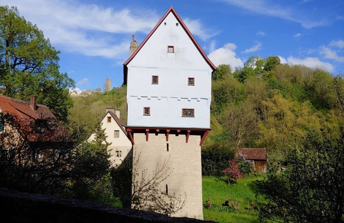 Enjoy the combination of nature and culture during your stay at the Fuchsmühle. You will be staying in the mill's former silo building, located directly on the Tauber River. Fall asleep to the sound of the water, and wake up to the chirping of birds. A steep footpath takes you to the historic old town of Rothenburg ob der Tauber, with its rich cultural and culinary offerings, in 15 minutes. Each of the Fuchsmühle's eight rooms has a private bathroom with shower and toilet. On the ground floor, there is a common area for up to 25 people with a fully equipped kitchen, a small veranda, and a courtyard with seating. Our house is ideal for family and friends gatherings.
